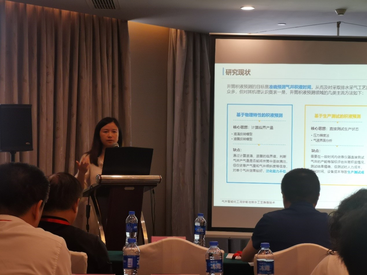 曾星杰代替四川省油氣智能化中心主任王楊,做題為“基于時序數(shù)據(jù)分析的油氣藏開發(fā)動態(tài)識別與優(yōu)化”的大會報告,介紹了石油數(shù)據(jù)分析方法在油氣田測井分析和生產(chǎn)優(yōu)化方面的應(yīng)用。陳雁教授在智慧油氣田建設(shè)專題論壇中做題為“氣井智能化工況診斷與排水工藝推薦技術(shù)”的報告,介紹了基于深度學習的智能排采技術(shù)和系統(tǒng)化方案,引起了廣泛討論。