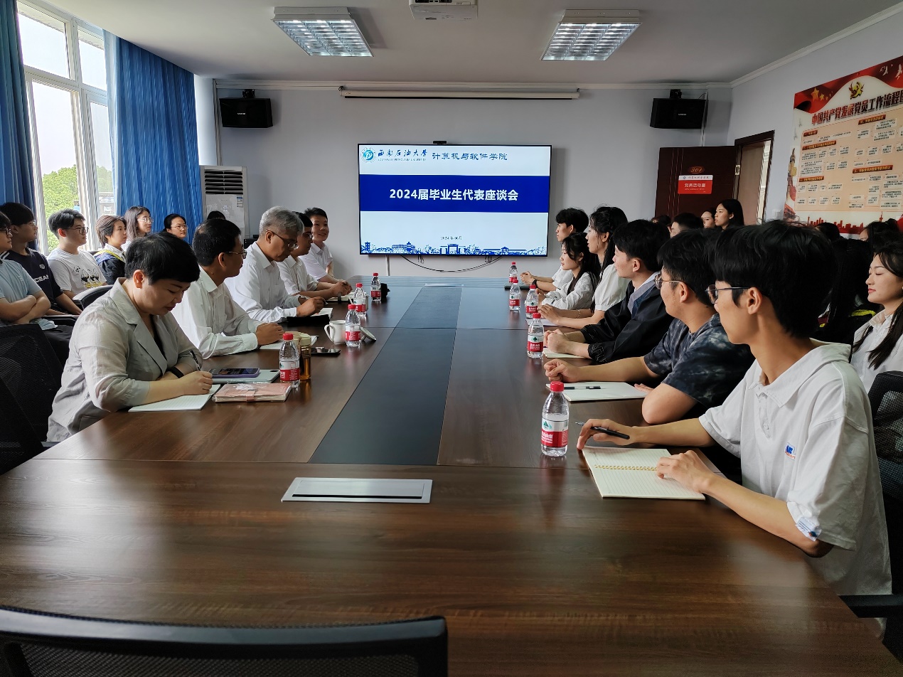 為做好2024屆畢業生各項畢業離校教育工作,6月5日,計算機與軟件學院(南充)在完井樓301開展了2024屆畢業生代表座談會。學院黨委書記李澗松、院長趙剛,副院長胥林、劉忠慧,畢業班輔導員及部分畢業生代表參與此次座談會,會議由胥林主持。