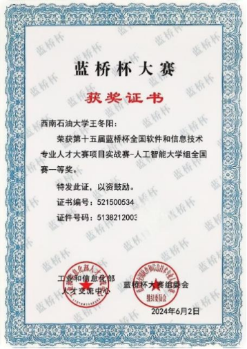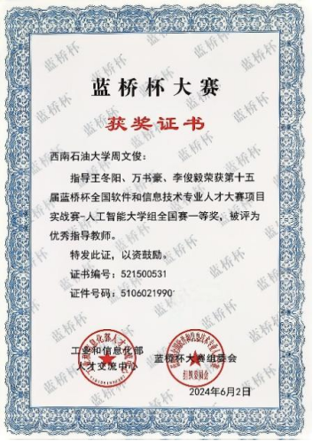 近日,第十五屆藍橋杯全國軟件和信息技術專業人才大賽項目實戰賽——人工智能全國總決賽圓滿落幕。此次盛會匯聚了來自電子科技大學、華中科技大學、江南大學等眾多高校的精英選手,共同展開激烈的智慧碰撞。由我院青年教師周文俊擔任指導老師,計算機科學與技術專業王冬陽同學領銜,與理學院人工智能專業的萬書豪、李俊毅兩位同學攜手組成的“龍鳳隊”,憑借出色的表現榮獲全國賽一等獎,并且榮登一等獎榜首,指導老師周文俊也榮獲優秀指導教師稱號。