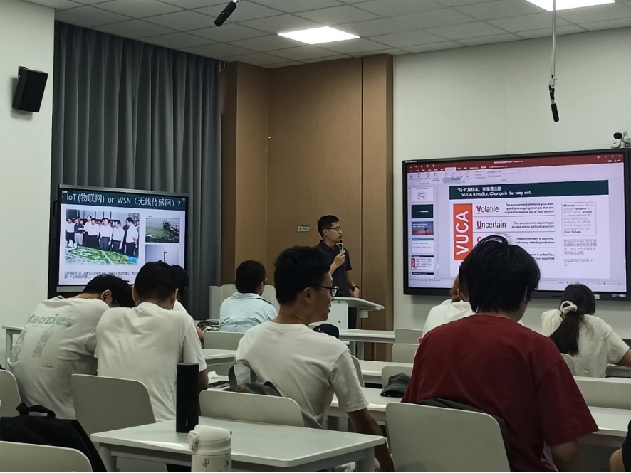 講座內容緊扣時代脈搏,分別從“物聯網那些事兒”、“創新與變革”以及“個人與職業發展”三大板塊展開,全面而深入地剖析了物聯網技術的現狀與未來。在“物聯網那些事兒”部分,周總從物聯網的基本概念出發,詳細闡述了物聯網技術的核心原理、發展歷程及當前應用現狀,讓同學們對物聯網有了更加全面而深入的理解。在“創新與變革”環節,周總結合物聯網行業的實際案例,分享了物聯網技術在智能制造、智慧城市、智慧農業等領域的創新應用,以及這些應用如何推動社會經濟的深刻變革。他強調物聯網作為新一代信息技術的重要組成部分,正以前所未有的速度和規模改變著我們的生活方式和生產方式,為各行各業帶來前所未有的發展機遇。