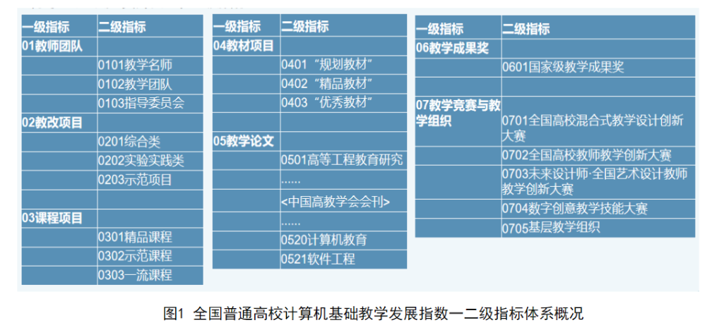 2024年11月9日,全國高等院校計算機基礎教育研究會聯合浙大城市學院高等教育數智評價中心和教師教學發展研究國家級虛擬教研室,首次發布了“全國普通高校計算機基礎教學發展指數”(以下簡稱“指數”)。指數涵蓋了如圖1所示的“7+1”個一級指標、33個二級指標和64個三級指標。這一指標體系全面而深入地反映了我國高校計算機基礎教學的現狀和水平,同時反映了教師層面的教學成果和學術貢獻以及學生在計算機競賽中的表現和成就。