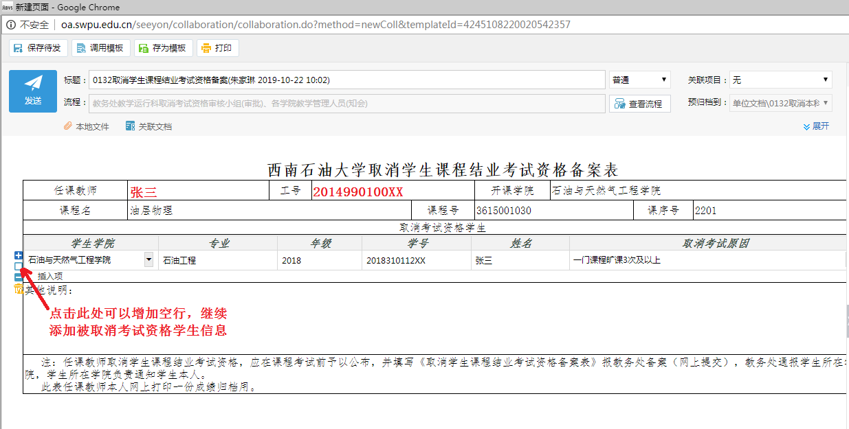 第三步:任課教師準確填寫課程信息和被取消考試資格學生的基本信息及取消考試資格原因,點擊“發送”,提交到教務處。