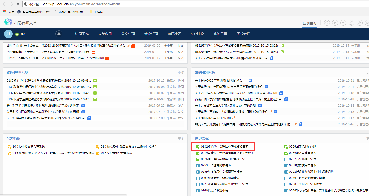 第二步:任課教師在“辦事流程”內選擇“0132取消學生課程結業考試資格備案表”;