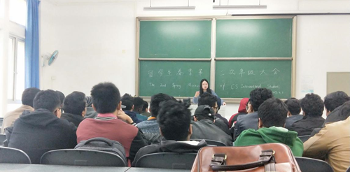 年級大會依始,陳思首先肯定了大家在運動會開幕式以及運動賽場上的優良表現,并為留學生Elton在賽場上取得的優異成績而感到驕傲,認為這是大家共同努力的結果,并希望接下來繼續保持這樣的積極性和團隊性;其次表揚了大家在留學生教育大會上按時守規的良好表現,體現了計科院集體留學生的精神面貌。接下來老師以清明假期為例,再次明確了每次請假的正確流程,并再次強調一定要如實履行請假手續,不要撒謊,注意自身人身和財產等安全。最后陳思重點提醒了課堂的出勤率問題,并告知留學生學院會不定時抽查課堂出勤情況,希望大家認真對待每一堂課。