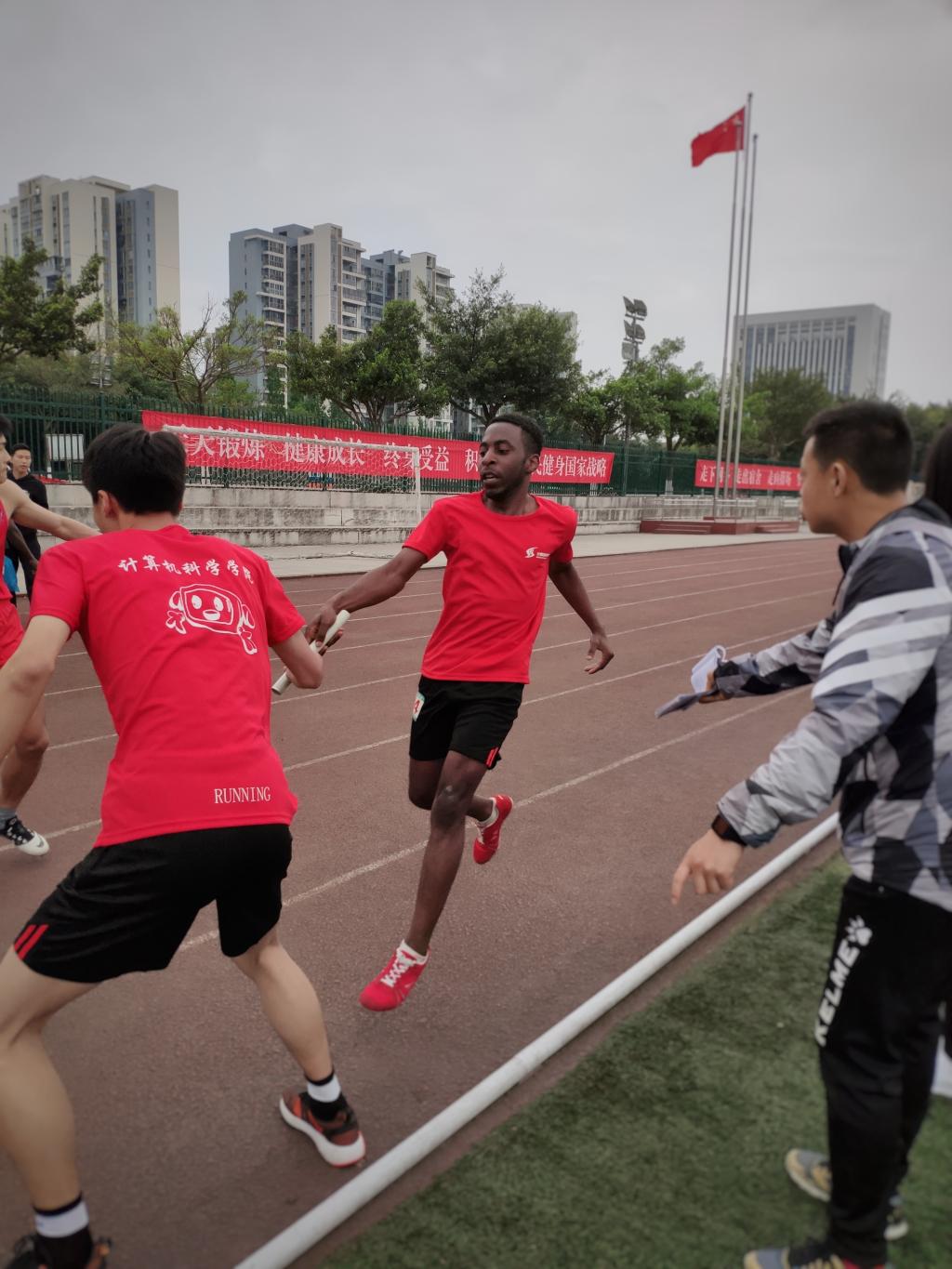 開(kāi)幕式第一項(xiàng)是教職工的50米迎面接力賽,十五個(gè)院共六組。比賽過(guò)程中由于地過(guò)于濕滑,不少老師因此而摔倒,但老師們輕傷不下火線,依舊一個(gè)接一個(gè)進(jìn)行著接力。頑強(qiáng)拼搏的精神感染著周?chē)拿恳粋€(gè)同學(xué)。我院學(xué)子也自發(fā)為老師們加油助威,搖旗吶喊,最后我院老師獲得了小組第一的成績(jī)。接著開(kāi)始的第二、三項(xiàng)是學(xué)生女子和男子100米預(yù)賽,來(lái)自我院的黎倩、徐靜文、郭忠杰以及黃震同學(xué)在賽場(chǎng)上拼搏,揮灑汗水,看臺(tái)上的觀眾也深受感染,一聲聲加油吶喊,一陣陣擊鼓助威,一次次鼓掌搖旗。