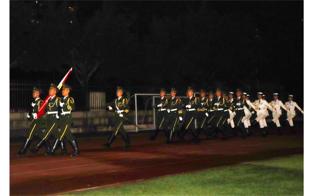 在主席臺發出號令后,全體師生集體向后轉,行注目禮,齊唱國歌,五星紅旗在莊嚴的國歌聲中冉冉升起。