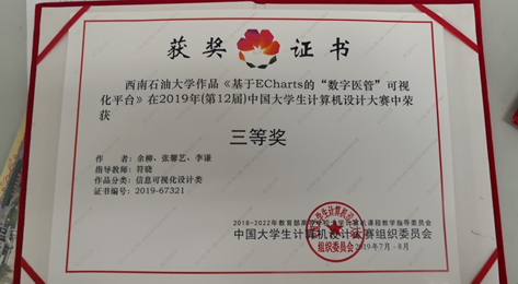 每年我們計科院學子都積極參加,今有我院指導的計算機協會學子:余柳、張馨藝、李謙榮獲2019年中國大學生計算機設計大賽國家級三等獎,特此祝賀!