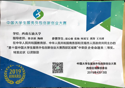 計算機協(xié)會一直注重軟硬件能力之外的培養(yǎng),今有計算機協(xié)會學(xué)子:趙心瑜、張揚、何雙寶、龔濤、王馮博榮獲2019年第十屆中國大學(xué)生服務(wù)外包創(chuàng)新創(chuàng)業(yè)大賽西部區(qū)域賽三等獎!