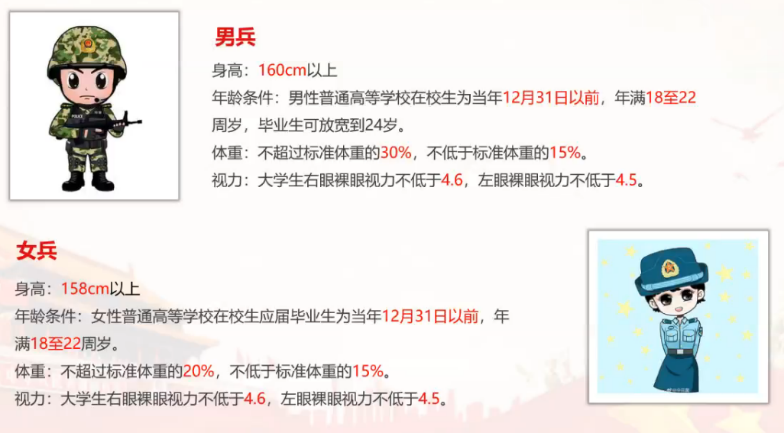 接下來,曾宏對應(yīng)征入伍對象與條件進(jìn)行介紹,結(jié)合學(xué)校實(shí)際情況講解了我校學(xué)生的入伍標(biāo)準(zhǔn),闡述了對男女身高、年齡條件、周歲、體重、視力的要求,并對征兵入伍政策進(jìn)行了具體的闡釋。
