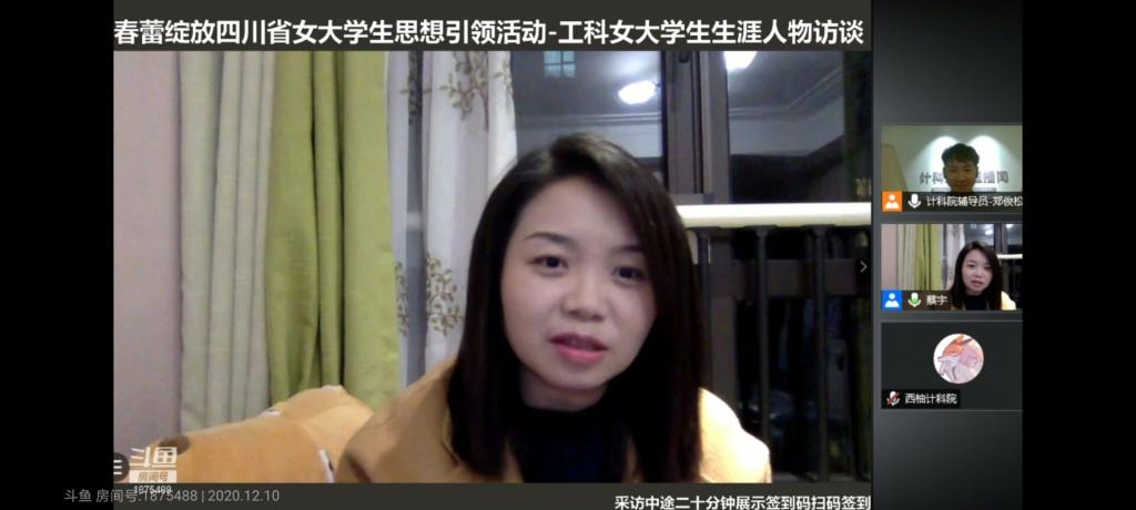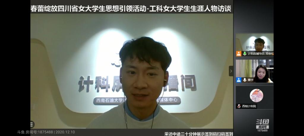 2020年12月10日晚19時(shí)30分,由四川省婦女聯(lián)合會(huì)、四川省教育廳、四川省互聯(lián)網(wǎng)信息辦公室主辦,西南石油大學(xué)承辦,計(jì)算機(jī)科學(xué)學(xué)院協(xié)辦的“‘春蕾綻放’四川省女大學(xué)生思想引領(lǐng)活動(dòng)——工科女大學(xué)生職業(yè)生涯人物訪談”在計(jì)科院斗魚(yú)直播平臺(tái)上正式舉行。本次活動(dòng)邀請(qǐng)到了計(jì)科院2006級(jí)碩士畢業(yè)生蔡宇作為主講嘉賓,其擁有10年互聯(lián)網(wǎng)產(chǎn)品經(jīng)理經(jīng)驗(yàn),曾任阿里巴巴資深產(chǎn)品經(jīng)理,現(xiàn)任B+輪母嬰互聯(lián)網(wǎng)公司年糕媽媽資深產(chǎn)品專家、產(chǎn)品總負(fù)責(zé)人。全校1236人次同學(xué)觀看本次直播,本次直播由計(jì)科院輔導(dǎo)員鄭俊松主持。