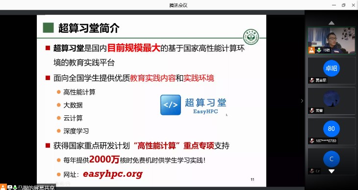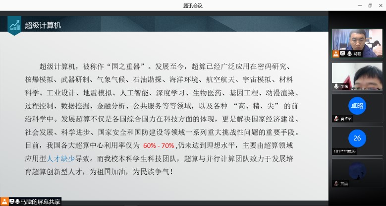 2020年12月10日下午,原定于線下舉行的超算團隊南充校區分團隊宣講會在騰訊會議平臺線上舉行,共有80余位同學準時在騰訊會議平臺參加本次宣講會。本次宣講會由南充校區信息學院李艷老師與超算團隊隊長馬聰同學共同主持。