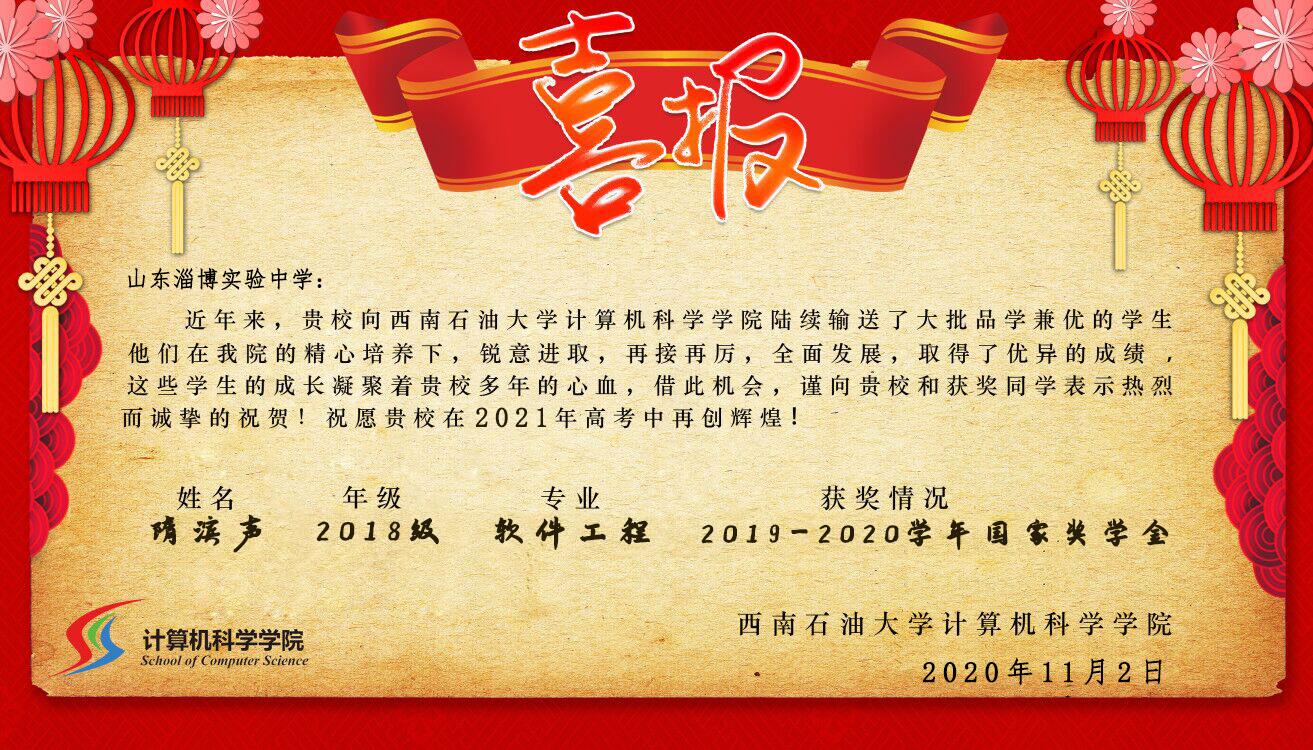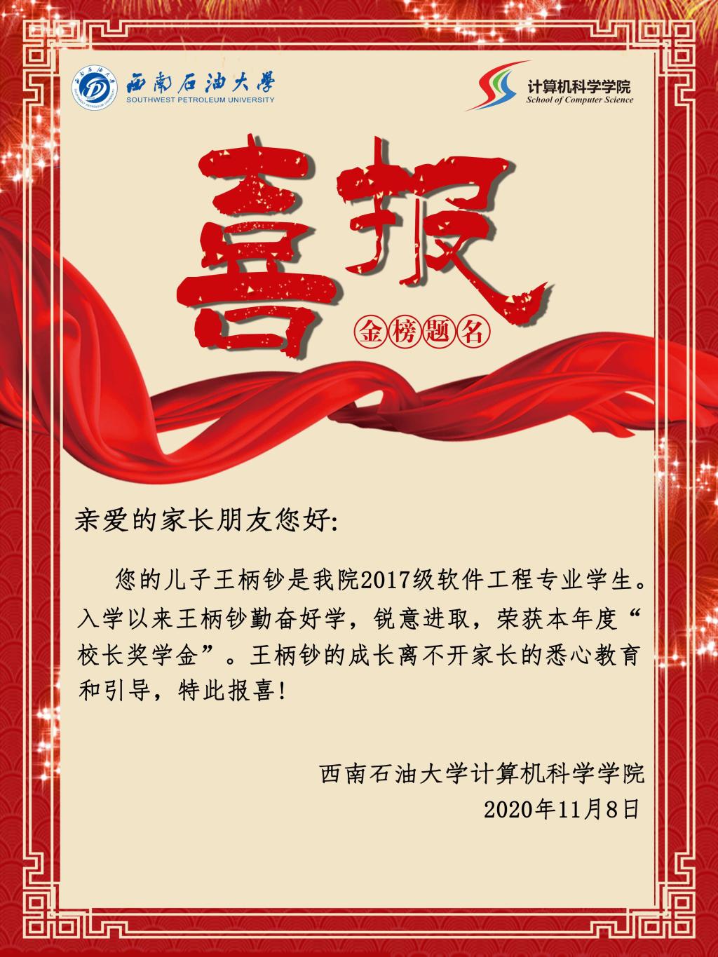 為了表彰、激勵計科院優秀在校學生,加強與中學的聯系吸引優質生源,增進家長對孩子在學校情況的了解。西南石油大學計算機科學學院將部分優秀學生在校獲獎情況,通過“喜報”的方式寄送至學生畢業高中及其父母手中。
