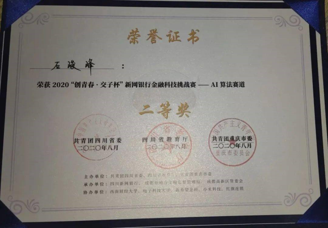 比賽過(guò)程中石峻峰最想感謝的是他的三個(gè)隊(duì)友,一個(gè)多月的時(shí)間,四個(gè)人天天都為分?jǐn)?shù)變動(dòng)而焦慮,也為了同一個(gè)目標(biāo)而努力。同時(shí)也要感謝鄭德生老師,石峻峰去年跟隨學(xué)長(zhǎng)參加2019年“創(chuàng)青春·交子杯”,在現(xiàn)場(chǎng)看見(jiàn)AI賽道決賽選手激烈的答辯,從而堅(jiān)定了自己走AI道路的想法,決定作為正式選手參加2020“創(chuàng)青春·交子杯”的比賽。
