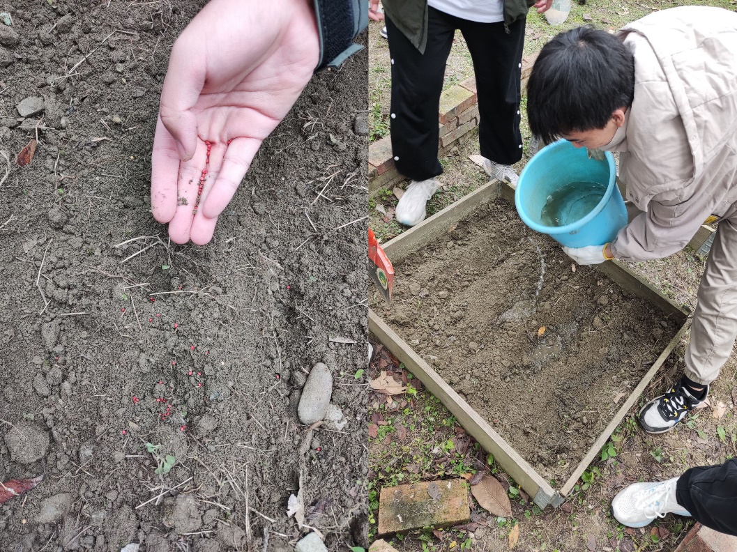 隨后,志愿者們紛紛拿起種子,撒在已經耕耘好的土地上,再添上一層混合了細沙的泥土,種下來年收貨蔬菜果實的希望,種下綠色發展的環保理念,種下旺盛的生命力。我們在貧瘠的土壤上播種下一顆希望的種子,靜靜凝望它的生長,于是在陽光的普照下,綠蔭的希望在這片土地之上盤旋。