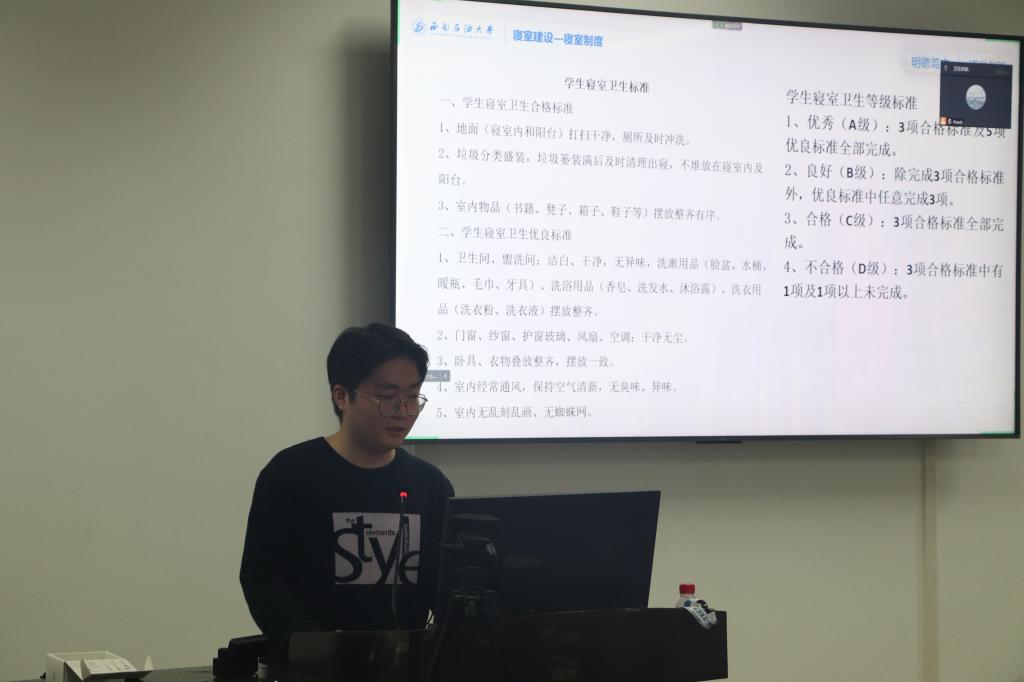 懸衡而知平,設規而知圓。宣講人明確提出寢室需要達到的衛生標準和紀律要求,同時學校會進行定期宿舍檢查,在每學期末對宿舍評級,評級優秀的宿舍會有綜測加分獎勵。