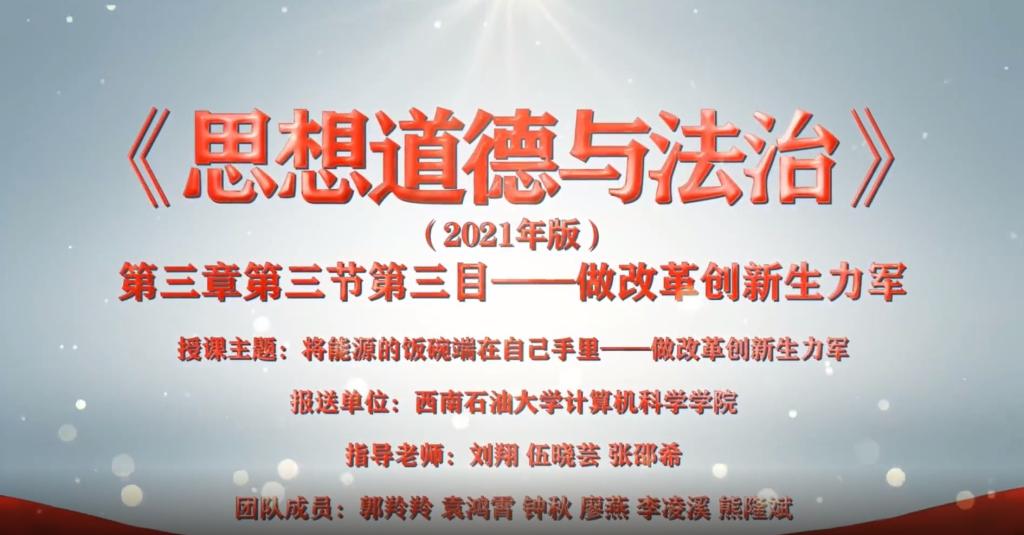 計科院團隊在學院黨委副書記、紀委書記劉翔老師的指導下,以“將能源的飯碗端在自己手里——做改革創新生力軍”為題,制作參賽微課。微課以習近平總書記考察勝利油田時提出 “能源的飯碗必須端在自己手里”的觀點引入:通過講述鐵人王進喜和中國工程院院士羅平亞的故事,向學生展示中國人能源的飯碗是歷經何種艱辛才端在自己手中;通過數據引用、論證等方法講清楚在新時代要端住能源的飯碗,需要將“爐子生在自己家中”,即要不斷創新新理論、新技術、新方法、新工藝;最后以我校科研團隊的事跡鼓勵青年大學生夯實基礎,增強本領,鍛煉能力,勇于創新創造,爭做改革創新生力軍,在實現中華民族偉大復興的接力跑中跑出好成績!