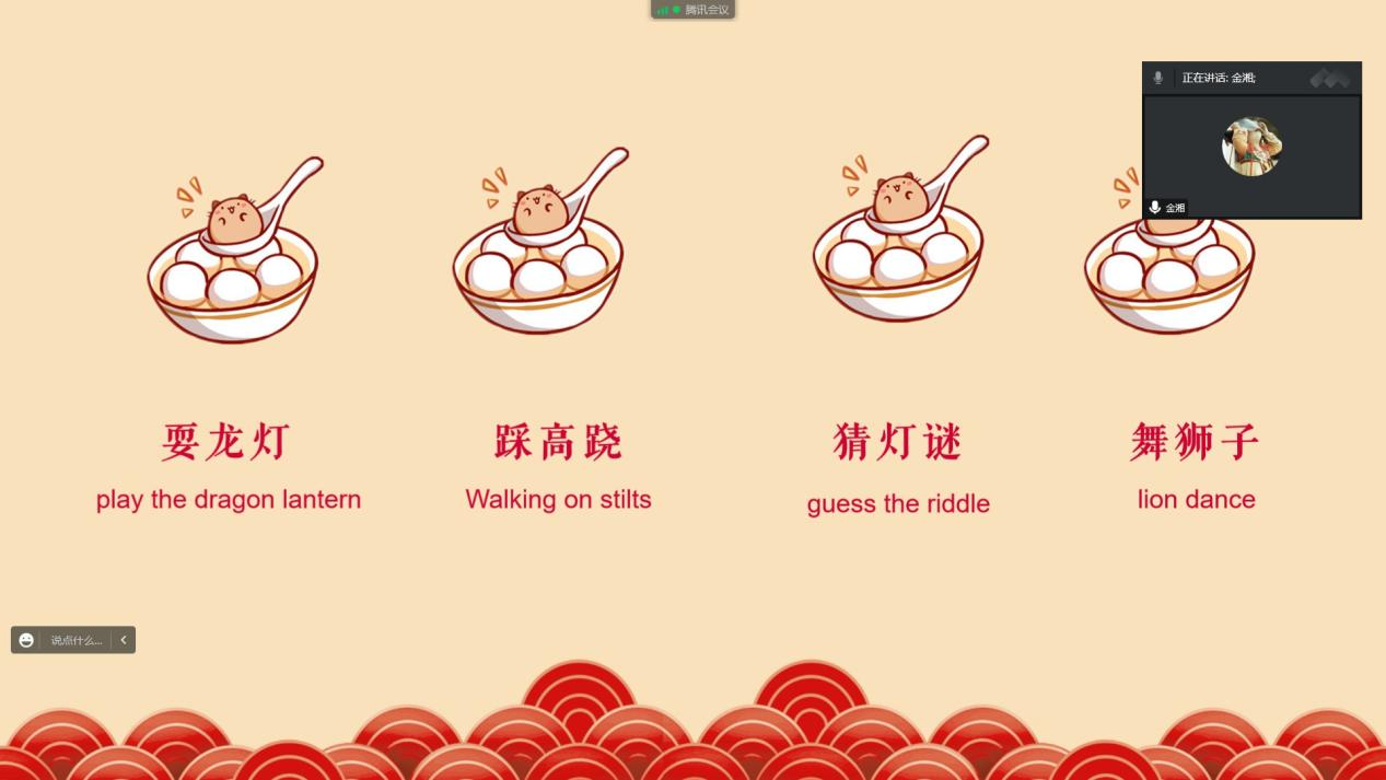 為進一步加深國際學生對中華傳統節日文化的理解,推動文化交流,12月10號下午,計算機科學學院于騰訊會議平臺進行了以“鬧元宵”為主題的線上分享活動。活動由國際生輔導員張藝萌主持,2020級網絡空間安全專業學生金湘進行分享,2022級國際學生參與此次分享活動。
