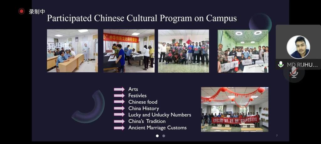 會上,三位來自不同國家的學生分享了自己來到中國、來到西南石油大學這個大家庭的有趣經歷和文化生活體驗。Shantu(小龍)同學是一名計算機科學與技術專業2019級的學生,來到成都三年有余,課余時間他參加過很多文化活動,他談到:“中國功夫尤其讓我癡迷,在一招一式的動作間我領略了中華武術的魅力,也增強了自己的體魄。”書法也是深受國際學生喜愛的一項中華優秀傳統文化項目,19級的Ruhul同學說:“漢字是一門很深的學問,寫好漢字更是一件有意義且樂趣無窮的事情,每一次落筆內心都很平靜?!鄙碓趪獾腞avindi同學也與大家一同分享了自己喜愛的中國美食,度過的中國節日以及結識的中國好友。