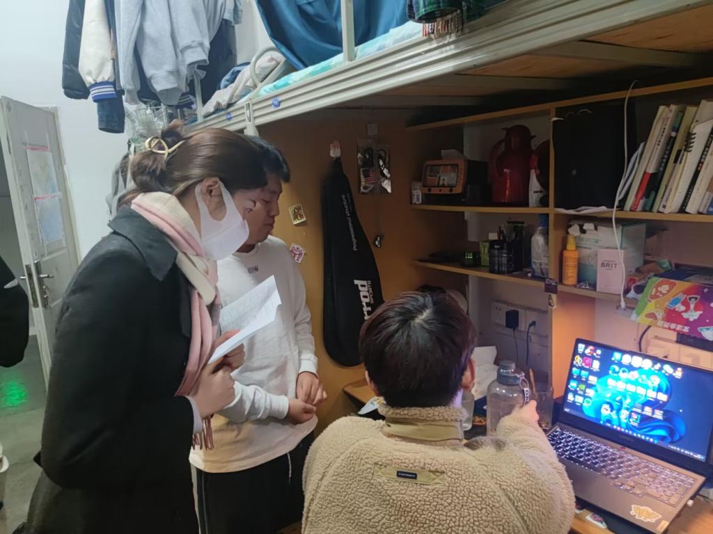 查寢過程中,輔導員老師們特別關注同學們返鄉的意愿和情況,重點了解在校生情況和思想動態。對于有返鄉意愿的同學們,叮囑返鄉途中要做好自我防護,線上學習要更加自律,有問題多與任課老師溝通,積極參與線上課程的互動。對因考研暫時留校的同學們,耐心詢問學習情況,并與同學們進行交流,提醒大家要講方法,講效率。提醒大家要多通風,勤洗手,出寢室取餐時務必佩戴好口罩。對有返鄉困難的同學,及時了解其困難具體原因,一對一針對性解決問題。輔導員老師們還逐一對宿舍里可能存在的安全隱患進行排查,著重叮囑同學們注意安全防護、注意寢室用電、遵守宿舍管理規定。
