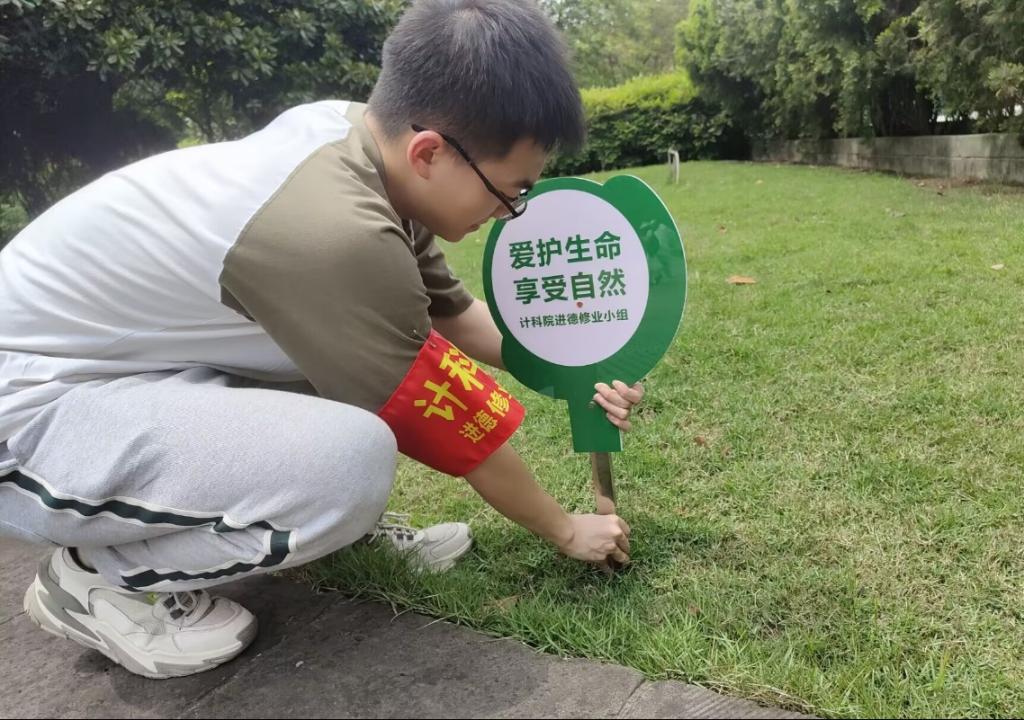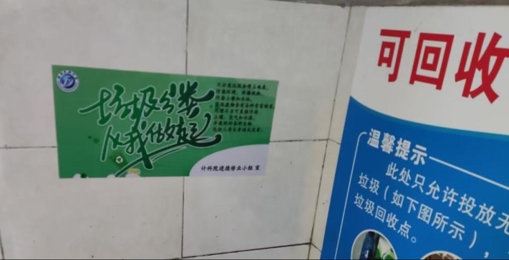 2023年5月16日團隊成員在宿舍樓可回收垃圾籃處張貼醒目標識,標注不進行垃圾分類造成的衛(wèi)生和資源浪費問題。通過標識展示,希望同學們能夠更加清楚地意識到自己的行為對環(huán)境的影響,并逐漸形成良好的垃圾分類習慣。同月,團隊成員在校內(nèi)綠化帶易被踩踏處設(shè)立6塊提示板,起到引導(dǎo)和提示的作用,提高同學愛護花草林木的自覺性。清理重點區(qū)域林間雜草、枯枝敗葉,撿拾草叢紙屑、塑料袋、亂石等廢棄物,改善局部綠化,促進校園生態(tài)“漸進式”轉(zhuǎn)變。
