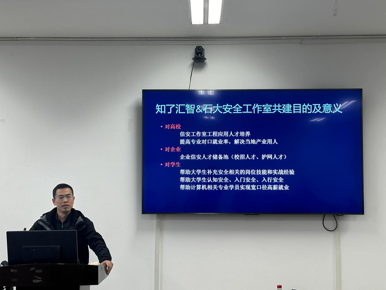 “數字經濟下的網絡安全發展機遇與人才需求”講座于12月13日在明理樓b306室召開。本次講座由網絡空間安全專業教研室主任張曉均主辦,邀請成都知了匯智科技有限公司技術總監、網絡安全工程師、全棧軟件工程師楊正輝總監,成都知了匯智公司產教融合中心總監楊宇總監,成都知了匯智公司項目經理陳萍經理。講座由2022級網安專業輔導員王鑫主持。