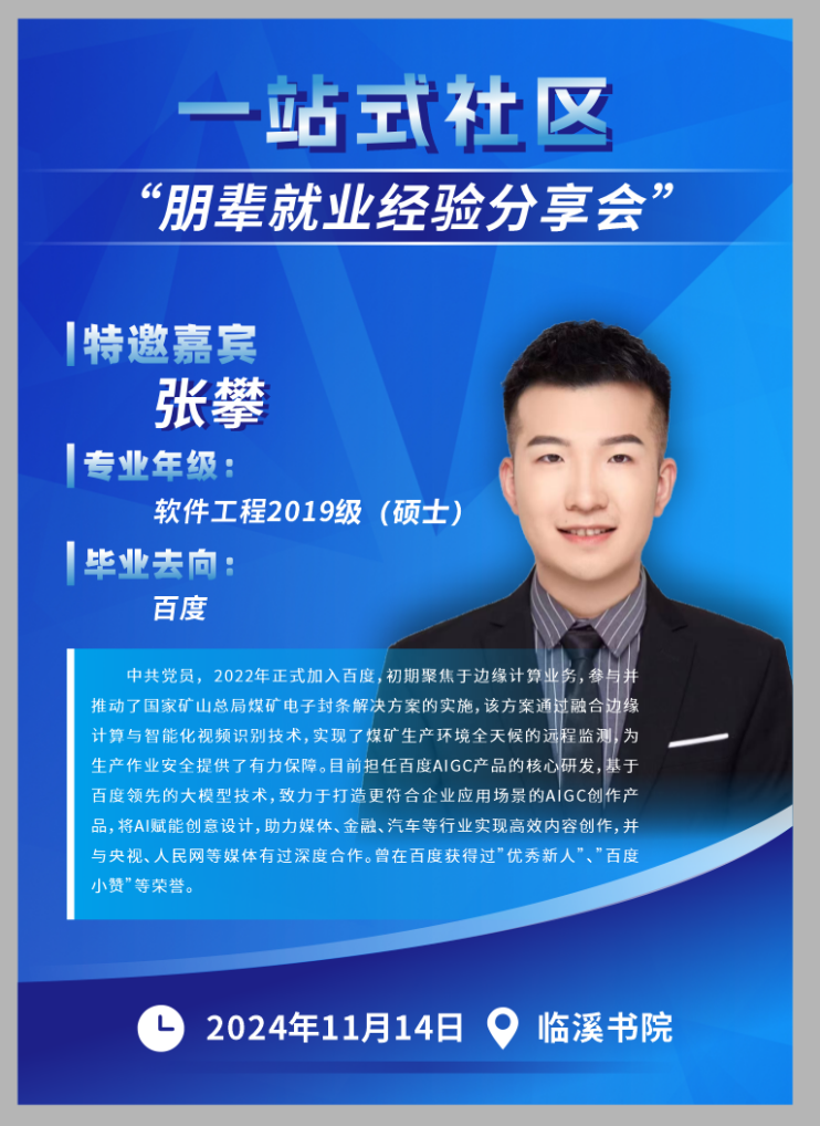 為了給我院學子提供一個與業界精英面對面交流的機會,深入了解互聯網行業的前沿動態與職業發展路徑,11月14日下午,我院邀請了就職于百度的19級軟件工程碩士張攀,于臨溪書院B區101自習室舉辦了朋輩經驗分享沙龍。計算機與軟件學院副院長彭博,研究生輔導員廖俊怡以及20余名研究生代表參加活動。