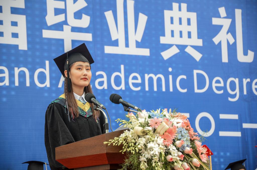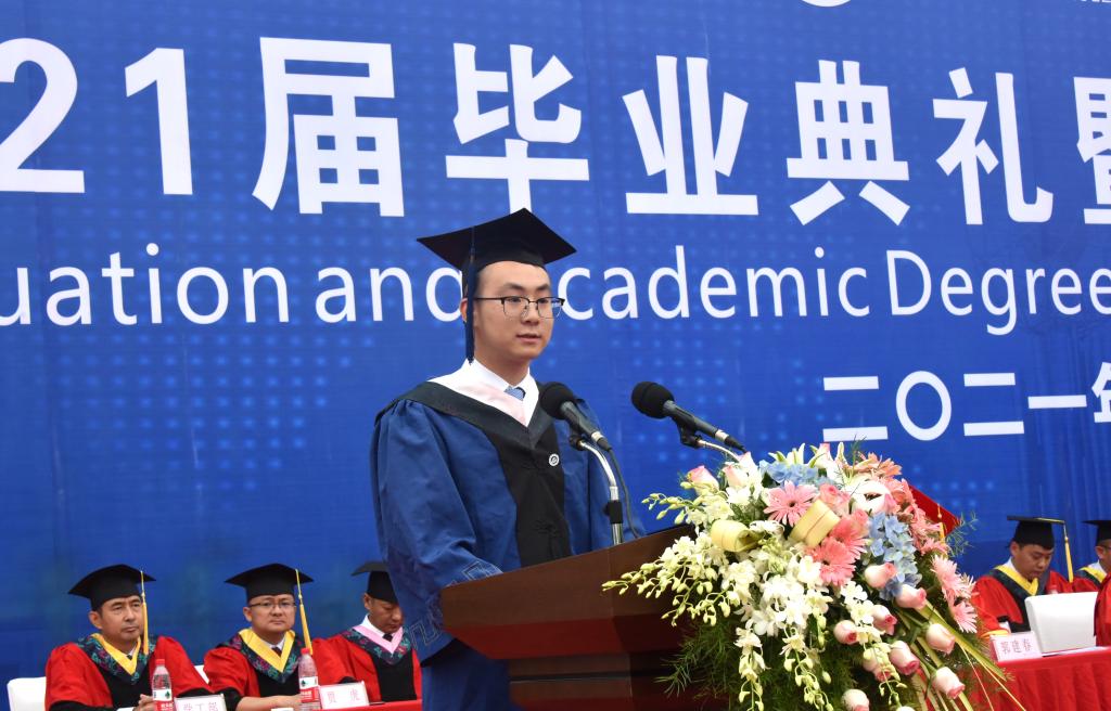 本科生學生代表,化學化工學院2021屆畢業生,四川省優秀畢業生馮雪飛懷著感恩的心表達對母校和老師的感謝。她說,與石大相遇,何其有幸。多年以后回想母校,一定還能想起那些年思學樓的朗朗書聲、圖書館的燈火闌珊、夢溪湖畔的楊柳依依。馮雪飛將去中國科學技術大學繼續深造。