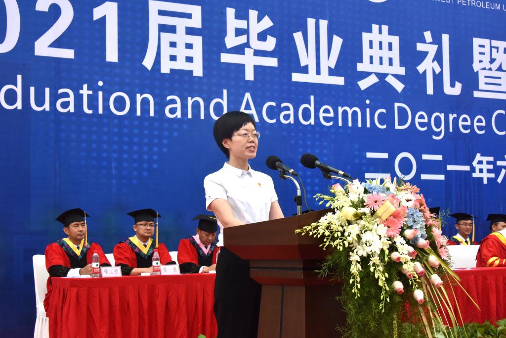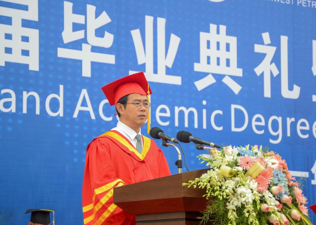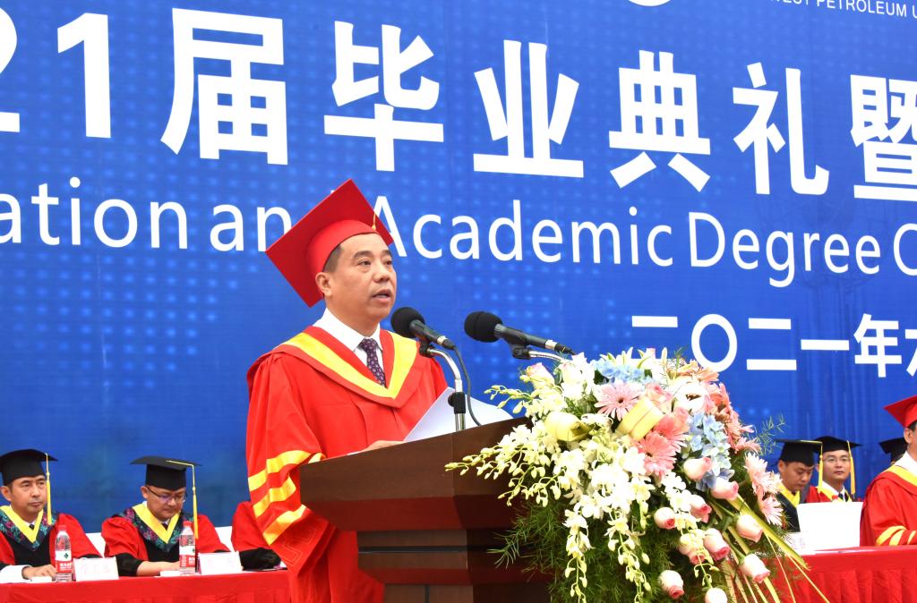 趙正文寄語全體畢業生,他指出,作為親歷“兩個一百年”交匯的新時代青年,你們的未來將融匯于中華民族偉大復興的新征程,你們正處在一個大有可為的時代。希望你們起而行之、勇挑重擔,積極投身新時代中國特色社會主義的偉大實踐,經風雨、見世面,真刀真槍錘煉能力,以過硬本領展現作為、不辱使命;希望你們始終牢記青年人承載著特殊的歷史使命和光榮的時代使命,積極主動作為,直面風險挑戰,以堅韌不拔的意志和無私無畏的勇氣,戰勝前行道路上的一切艱難險阻,在腳踏實地和仰望星空中綻放絢麗的青春之花;希望同學們繼續秉承西南石大“實事求是,艱苦奮斗”的優良傳統,弘揚“為祖國加油,為民族爭氣”的大學精神,不忘初心,砥礪前行,在新的人生旅程中再寫美麗華章。