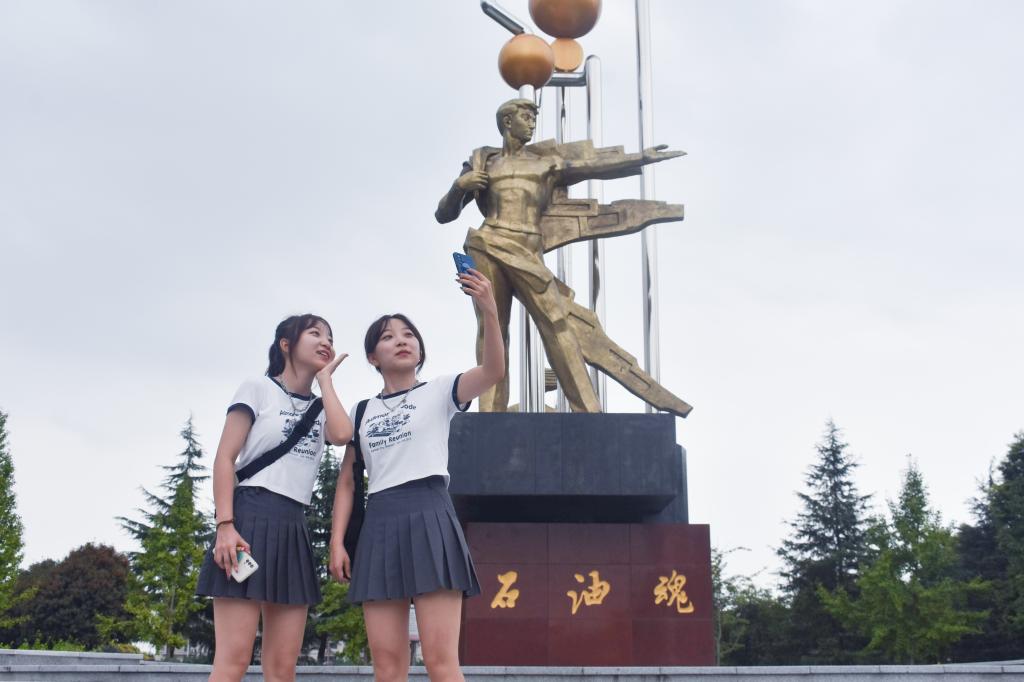 石油魂雕像下合影