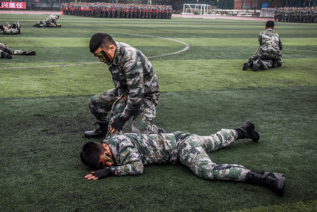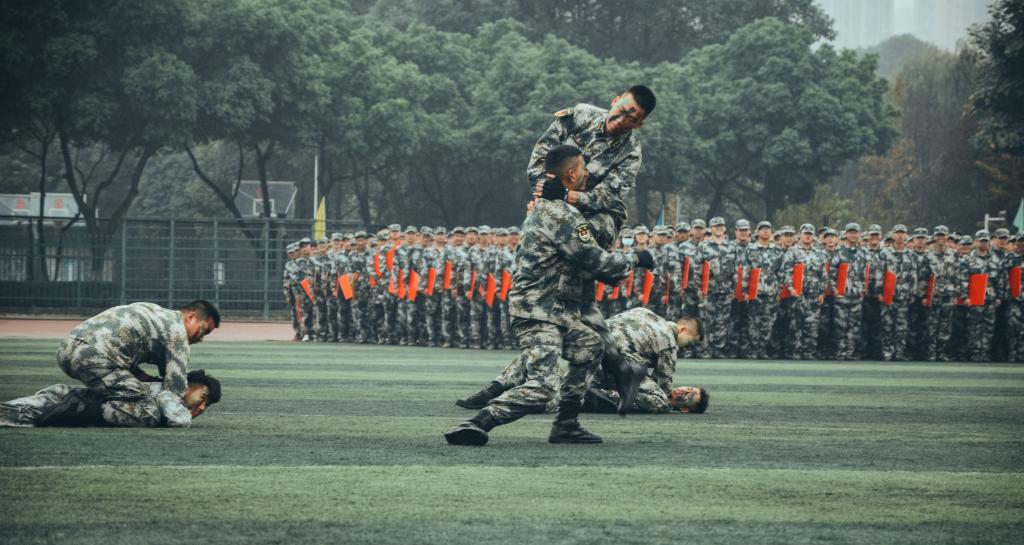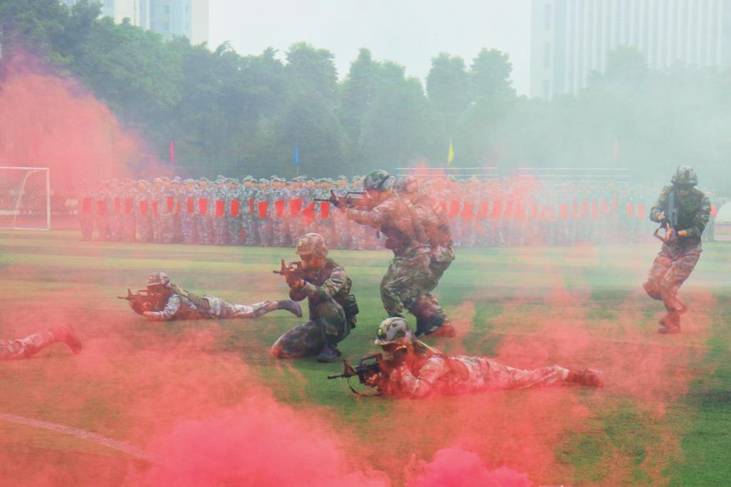迎軍旗儀式后,閱兵式開始。刺殺操方隊、倒功操方隊、擒拿格斗方隊、綜合科目匯報方隊、紅歌合唱演練方隊等依次登場,他們目光堅定,步履矯健,動作整齊,氣勢高昂,彰顯了保家衛國的決心。