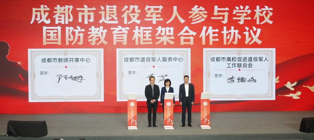 李德海代表聯(lián)合會(huì)發(fā)言。他介紹了聯(lián)合會(huì)籌備歷程、西南石油大學(xué)退伍大學(xué)生培養(yǎng)等工作,并代表聯(lián)合會(huì)與成都市烈士紀(jì)念設(shè)施保護(hù)中心簽訂紅色教育資源基地合作協(xié)議,與成都市教師共享中心、成都市退役軍人服務(wù)中心簽訂成都市退役軍人參與學(xué)校國(guó)防教育框架合作協(xié)議。