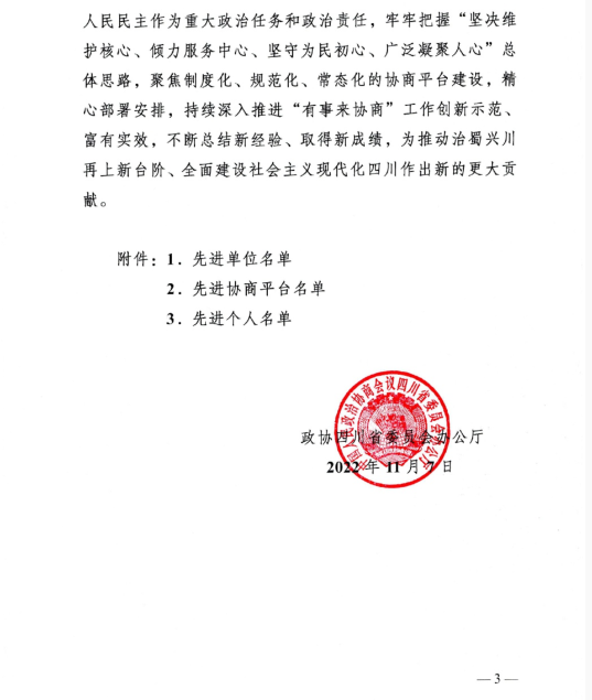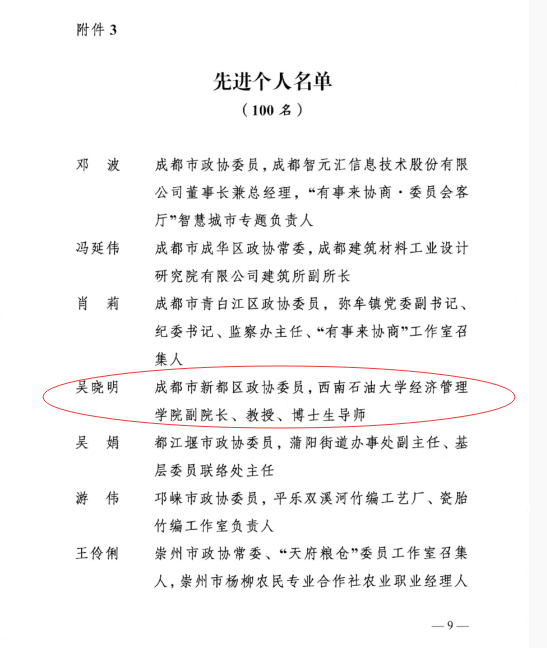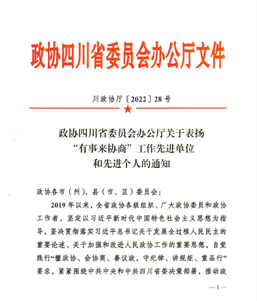 近日,政協四川省委員會辦公廳印發了《政協四川省委員會辦公廳關于表楊“有事來協商”工作先進單位和先進個人的通知》(川政協廳[2022]28號),學院副院長兼MBA教育中心主任吳曉明教授作為“有事來協商”工作先進個人受到政協四川省委員會辦公廳的表揚。
