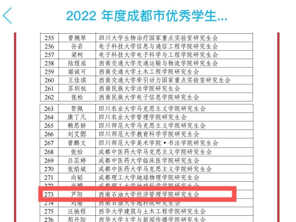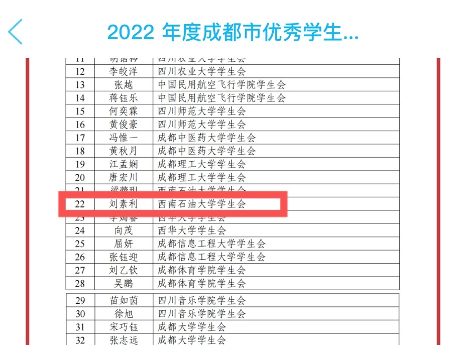 5月26日,成都市學生聯(lián)合會發(fā)布2022年度成都市優(yōu)秀學生會組織名單、成都市學生會組織優(yōu)秀指導教師名單和成都市學生會組織優(yōu)秀工作人員名單,我院學生會榜上有名,連續(xù)三年榮獲“成都市優(yōu)秀學生會組織”稱號,院團委書記劉波老師榮獲“成都市學生會組織優(yōu)秀指導教師”,工業(yè)工程與管理2021級碩士研究生蘆陽、石油工程管理2021級博士研究生徐青和會計學2020級本科生劉素利榮獲“成都市學生會組織優(yōu)秀工作人員”。