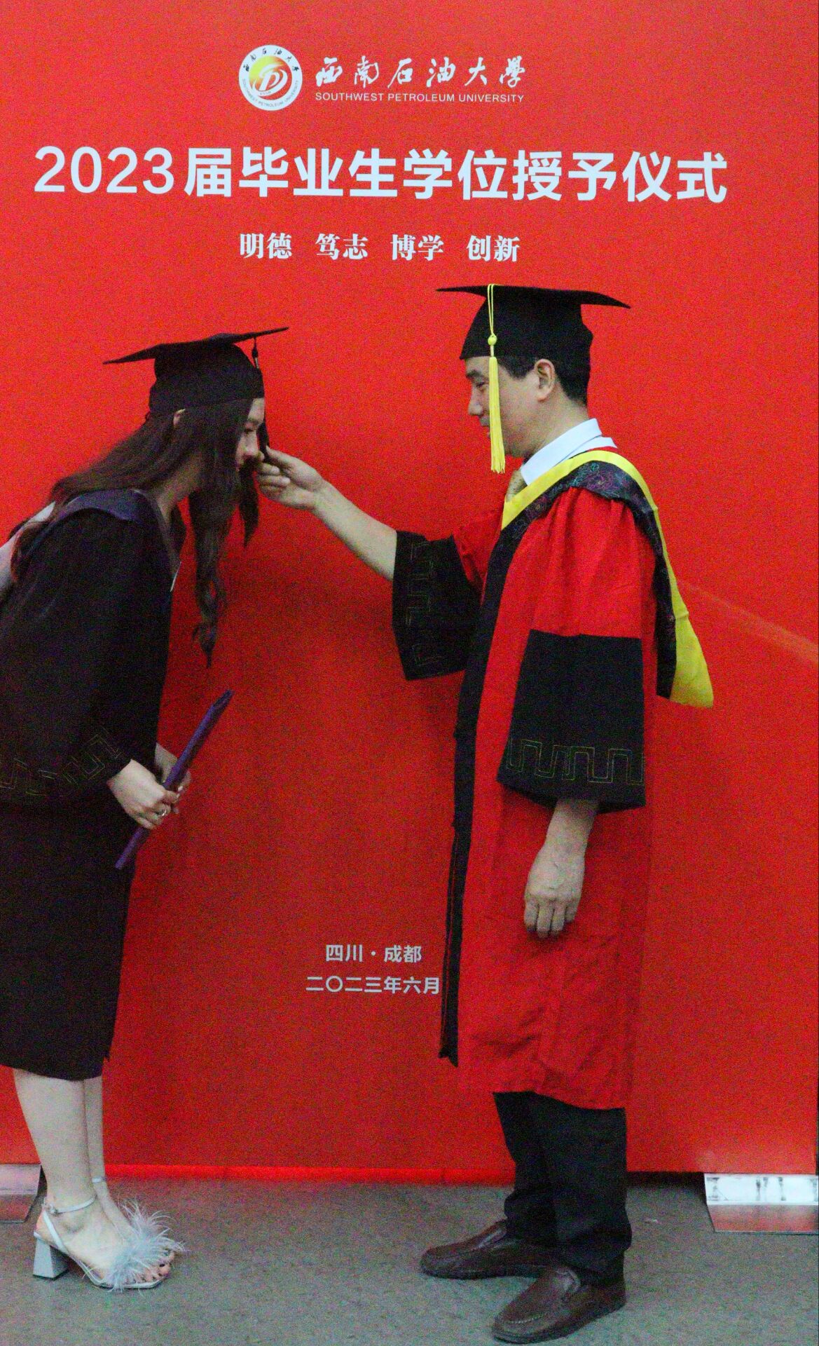 身著學士服的畢業生們,井然有序地進入會場,黨劉栓和鄭小強為他們頒發畢業證書和學士學位證書,撥穗正冠并合影留念,家長代表為畢業生記錄下這一美好時刻。會計學專業畢業生楊冰慧在授位儀式結束后寄語學弟學妹們,珍惜大學時光,好好學習,不負韶華。
