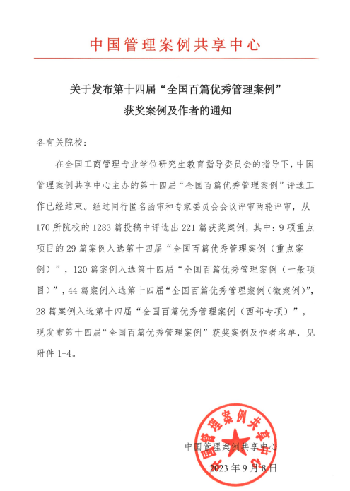此次申報有來自全國170所院校1283篇案例投稿。據悉,“百優案例”開發能力是衡量一所學校工商管理專業學位研究生教育水平的重要指標,被納入教育部2012年第三輪學科評估指標體系(C5指標)和2016年、2018和2021年的工商管理碩士專業學位水平評估指標體系(C1指標)。