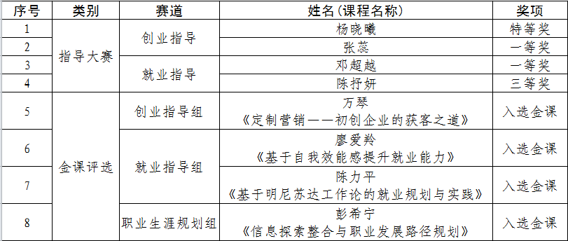 大賽分本科高校創業組和就業指導組,評選出特等獎各1項、一等獎各3項、二等獎各5項、三等獎各7項,2023年高校就業創業指導金課30門(創業指導組、就業指導組、職業生涯規劃指導組各10門)。賽事和金課評選活動由四川省教育廳、四川省人力資源和社會保障廳聯合主辦,是四川省就業創業領域最高級別的教師教學競賽。