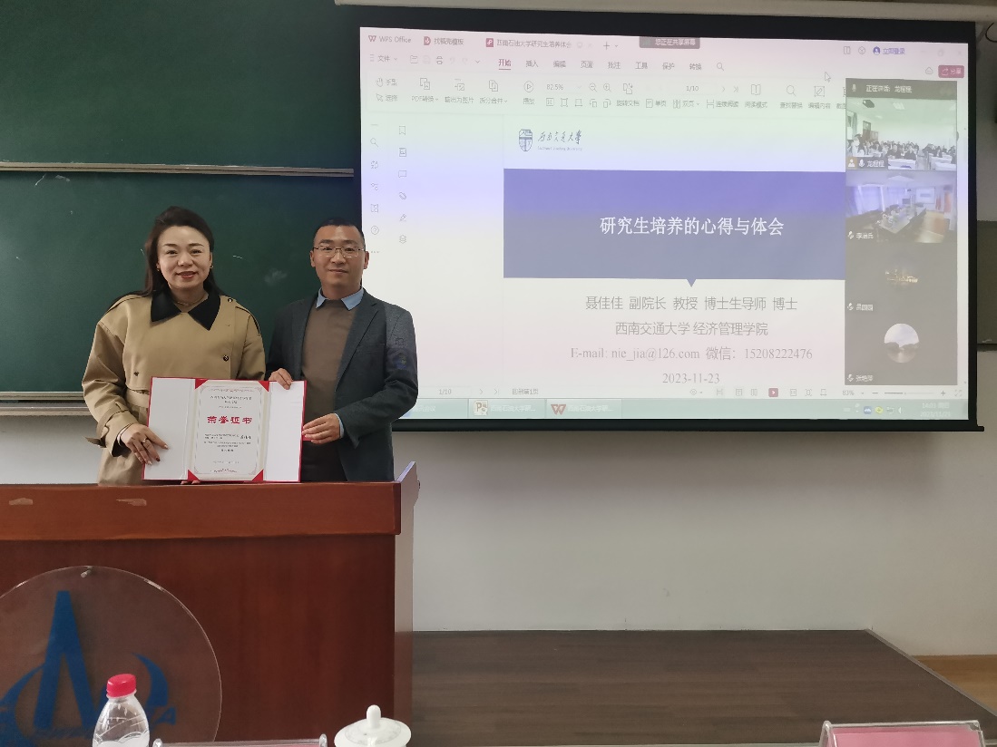 11月23日下午,我院在博學(xué)樓B407召開研究生導(dǎo)師培訓(xùn)會,邀請西南交通大學(xué)經(jīng)濟(jì)管理學(xué)院副院長聶佳佳教授作題為“研究生培養(yǎng)的心得與體會”的講座,學(xué)院副院長蘇昊主持,學(xué)院副院長、MBA教育中心主任吳曉明為聶佳佳教授頒發(fā)了講座嘉賓榮譽(yù)證書。