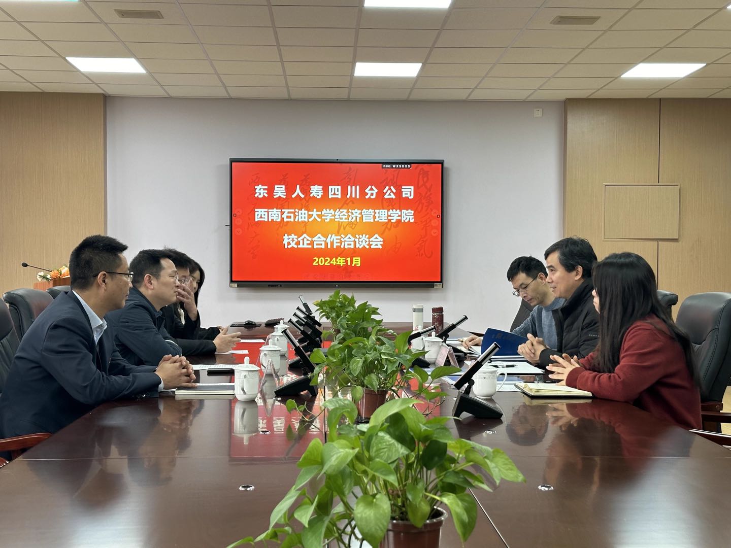 黨劉栓介紹了學院的發展歷程、學科專業、人才培養、科學研究、社會服務等方面的情況,他表示,學院歷來高度重視校企合作,通過與企業的緊密合作,能夠有效提升學生的實踐能力和就業競爭力。張繼業介紹了東吳人壽保險公司以及四川分公司的情況,他表示,公司非常重視與高校的合作,希望通過與西南石油大學經濟管理學院的合作,共同探索人才培養的新模式,為公司的發展注入新的活力。雙方就校企合作的具體事宜開展進行了深入探討,圍繞“合作菜單”積極探索校企共建活動方案。