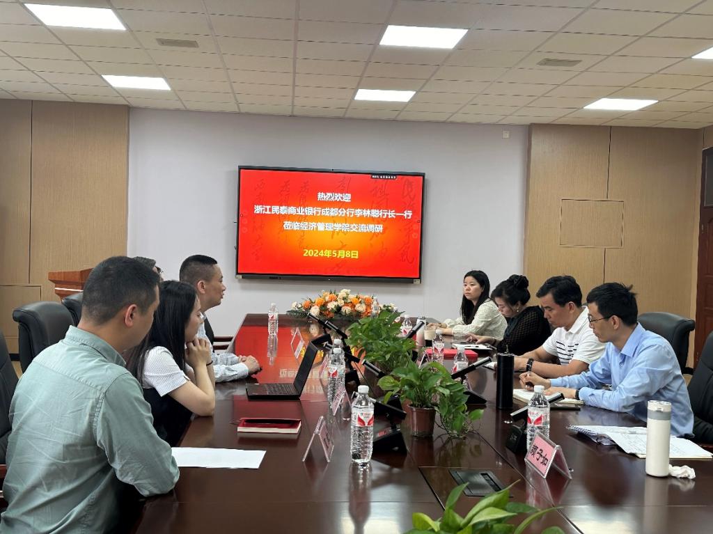 5月8日下午,浙江民泰商業(yè)銀行成都分行行長李林聰?shù)?/span>一行五人來我院進行交流調(diào)研,學院黨委書記黨劉栓,黨委副書記、紀委書記曾有為,副院長吳曉明等與來客進行工作交流。