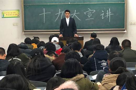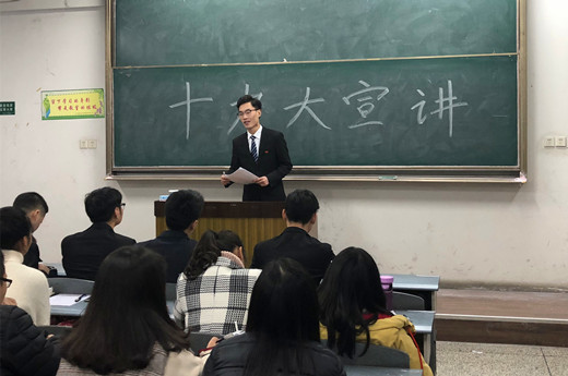 12月26日晚,我校黨的十九大精神學生宣講團來到博學樓B302向在場的同學宣講十九大精神,法學院2015級的汪佳材、石工院2016級牛烺昱、材料院2015級鐘詩宇、藝術院2014級高源和計科院碩2016級的鄭俊松組成本次宣講團,我院2017級公共事業管理和會計學的同學積極參與本次宣講會。