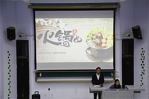 “沒吃過四川的火鍋,那就不能說你吃過火鍋。”來自2016級油氣儲運的聶山是一名地道的四川小伙子,最愛的食物便是地道的四川火鍋。通過播放關于火鍋的段視頻,聶山讓大家理解為何他對火鍋如此熱衷;另外,他也從“名人火鍋趣事”、“火鍋的來歷”、“自己的火鍋經歷”和“名家品火鍋”這四個方面入手,向大家詳細解讀了四川人對于火鍋的炙熱情感。
