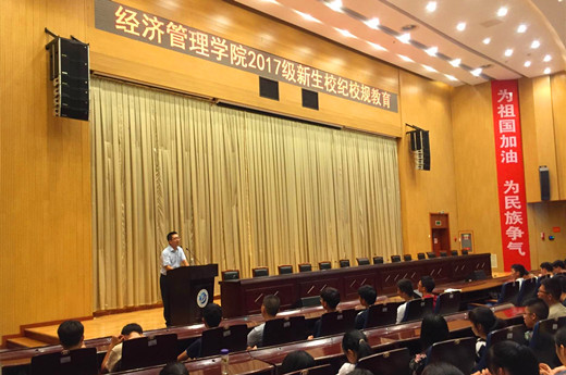 9月11日下午,學院2017級新生校紀校規專題教育在圖書館報告廳舉行,學院黨委副書記覃吉春擔任主講人。