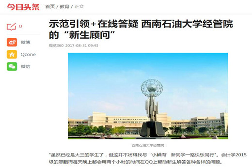 今日頭條網(wǎng)報道說,“新生顧問” 延伸了育人時間軸跨度,將思政教育前移至入學(xué)前的暑假。同時注重將學(xué)生自我教育和示范引領(lǐng)相結(jié)合,拓展了思政教育的途徑和載體。