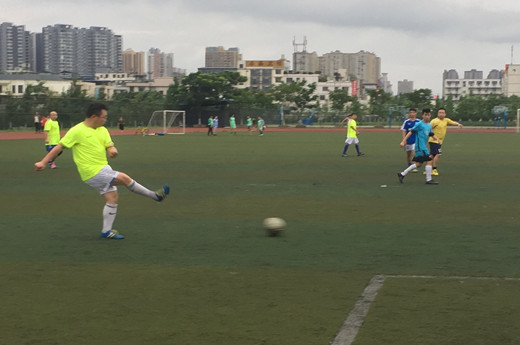 比賽開始,開局僅兩分鐘,教師蔡佳峻破門建功,隨后畢業生代表隊不甘落后,在后來的比賽中追平比分并逐漸反超。賽場上,郭志鋼顯得格外活躍,他口中提醒著隊友們:“注意配合、防守、防守!”老師們都在賽場上不遺余力的奔跑著,是在小雨中對這批畢業生最好的送別。