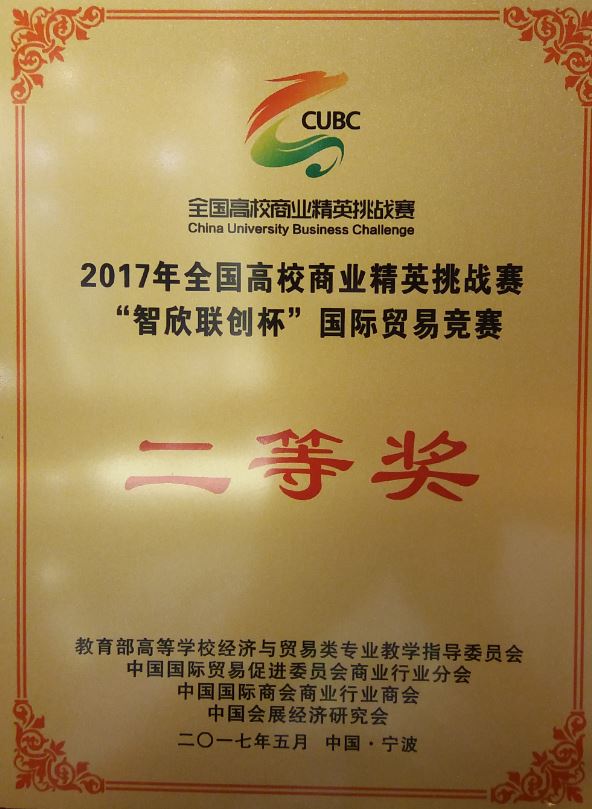 5月25日至5月31日,2017年全國(guó)高校商業(yè)精英挑戰(zhàn)賽“智欣聯(lián)創(chuàng)杯”國(guó)際貿(mào)易競(jìng)賽暨“商業(yè)貿(mào)促杯”經(jīng)貿(mào)會(huì)展競(jìng)賽在寧波國(guó)際會(huì)展中心舉行,我校代表隊(duì)榮獲全國(guó)二等獎(jiǎng),指導(dǎo)教師林建、劉仕華在本次競(jìng)賽中獲得優(yōu)秀指導(dǎo)教師。該競(jìng)賽是由教育部高等學(xué)校經(jīng)濟(jì)與貿(mào)易類專業(yè)教學(xué)指導(dǎo)委員會(huì)、中國(guó)貿(mào)促會(huì)商業(yè)行業(yè)分會(huì)、中國(guó)國(guó)際商會(huì)商業(yè)行業(yè)商會(huì)和中國(guó)會(huì)展經(jīng)濟(jì)研究會(huì)聯(lián)合主辦的國(guó)家級(jí)、國(guó)際性的學(xué)科競(jìng)賽與創(chuàng)新實(shí)踐活動(dòng)。