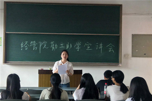 為了讓報名參加學工助理崗位應聘的同學們提前了解勤工助學崗位的具體要求,6月5日下午經(jīng)管院勤工助學崗位宣講會在博學樓B302召開,經(jīng)管院輔導員嚴旭擔任主講人。