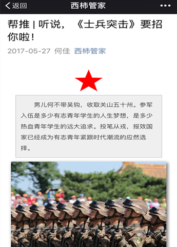 為加大征兵宣傳力度,提升宣傳效果,學(xué)院通過(guò)各種新媒體發(fā)布應(yīng)征入伍的相關(guān)信息。宣傳期間,學(xué)院微信公眾號(hào)西柿管家發(fā)表征兵專(zhuān)題報(bào)道,以《士兵突擊》為切入點(diǎn)吸引大家了解征兵相關(guān)事宜;學(xué)院各班級(jí)班群發(fā)布關(guān)于2017年大學(xué)生應(yīng)征入伍咨詢(xún)周活動(dòng)情動(dòng)通知;學(xué)院網(wǎng)站則推送征兵方式等信息,多種新媒體渠道相結(jié)合的方式讓征兵消息宣傳覆蓋面廣、傳播效果好。