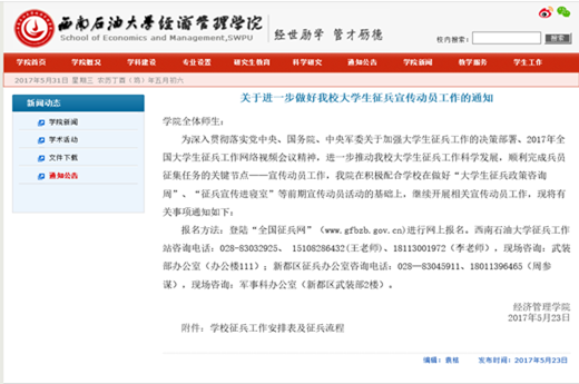 學(xué)院網(wǎng)站發(fā)布開(kāi)展征兵工作通知