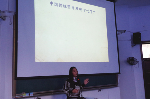 第一位出場(chǎng)的李茁瑩圍繞“如何過(guò)好傳統(tǒng)節(jié)日”這個(gè)話題展開(kāi)了講述。通過(guò)對(duì)比當(dāng)代人與古人對(duì)待傳統(tǒng)節(jié)日的態(tài)度以及身邊的一些細(xì)小例子,李茁瑩指出了我們現(xiàn)代生活中大部分人對(duì)待傳統(tǒng)節(jié)日存在著“敷衍”的這個(gè)事實(shí)現(xiàn)象。
