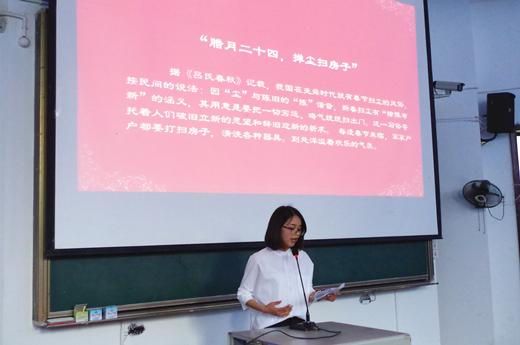 春節(jié)作為我國(guó)最具特色的傳統(tǒng)節(jié)日之一被大家所重視。胡彩霞則借春節(jié)的習(xí)俗與起源等向大家講述了春節(jié)。貼春聯(lián),放鞭炮,守歲,吃團(tuán)圓飯等習(xí)俗被我們所熟悉,至今也仍然存在于我們的生活當(dāng)中。
